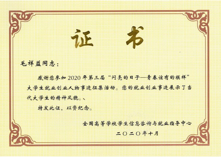 在建校四十周年之际我校举办了美育教育展示晚会,我获得了“优秀演员”证书。在之后的排球比赛方面,我参加了学院排球队,我们荣获比赛第一名。