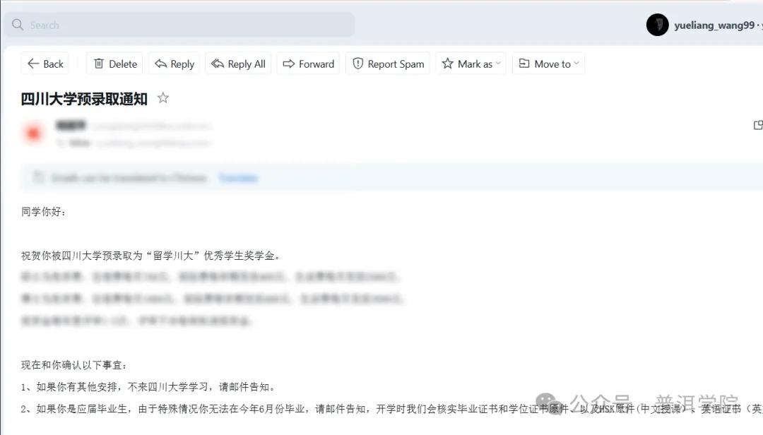 从今年3月1日到3月21日,她连续三周每天坚持给川大的多位教授发邮件,自我介绍、表达学术规划、附上成绩与简历,希望能得到导师的接收。其间,大多数邮件石沉大海,但她没有放弃,最终,一位外籍教授被她的真诚打动,给了她一封期待已久的回信,她终于凭借努力敲开了川大研究生的大门。