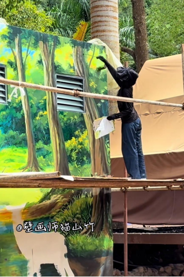 毕业后,她选择以美术老师的身份沉淀自我,成立了“猫山竹画室”,主要从事墙绘、美术培训等业务。在培训学校的课堂上,她不仅要将绘画技巧传授给学生,更要学会从不同视角理解艺术表达,这份教学经历让她对色彩、构图与受众感知的把控愈发精准。与此同时,她未放下心中的壁画梦,利用课余时间接墙绘订单,从社区楼道到商铺门面,每一面空白的墙壁都成了她实践的画布,在画笔与墙体的碰撞中,逐渐形成了自己独特的创作风格。