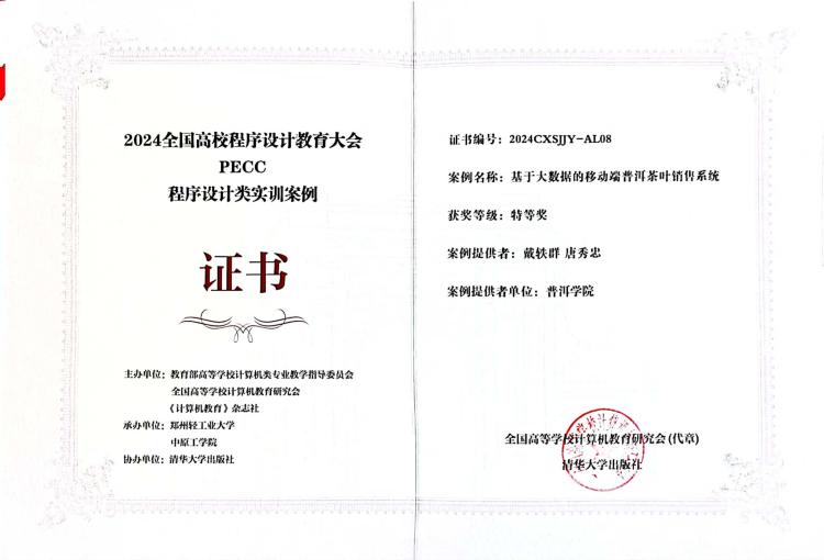 在推进专业质量提升方面,学院取得了显著成效。以工程认证为目标,协助合作专业负责人修订人才培养方案并加强专业内涵建设。开通云实践平台全资源课程,组织开展内部集体磨课,交流教学经验,举办“人工智能时代AI赋能数字化教学”师资培训、“人工智能时代AI赋能数字化教学”和“AI 赋能新工科建设——人工智能行业前沿技术及产业项目实践教学能力提升”师资培训等高水平师资培训方式,学院的教学实力得到了显著增强。例如,在“2024年全国程序设计类实训案例评选”中,学院参赛作品《基于大数据的移动端普洱茶叶销售系统》荣获全国特等奖;《基于鸿蒙硬件系统下的监测心率及血氧实验案例的设计》在第九届全国计算机类课程实验教学案例评选中荣获二等奖;实验案例《基于Python的普洱市地震分析的可视化实验案例》、教学案例《看“黑客帝国”,学Python中的random模块用法》在第六届中国计算机教育大会计算机类教学和实验案例评选中分别荣获二等奖;《基于大语言模型的临床疼痛疾病自然语言处理分析与数字化》项目进入云南省科技厅2025年重点领域科技计划项目答辩环节。这些荣誉的获得,充分展示了学院在数字赋能和数字技术应用方面的实力和专业水平。